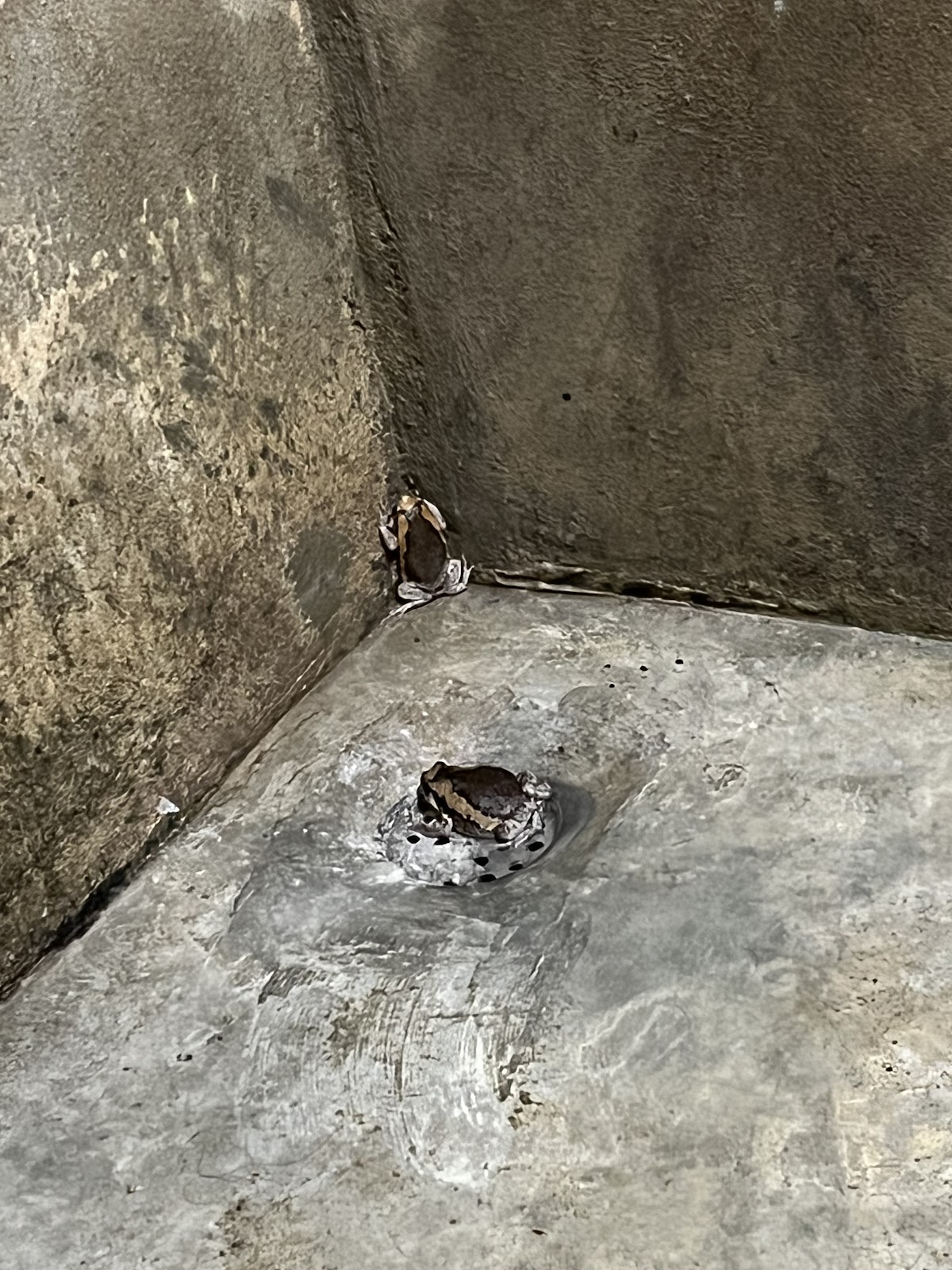 As you can see this is referring to actual frogs and not a euphemism for anything. This may only be specific to my experience and the specific bathrooms of the houses I happened to live in, but these little guys sure do bring me joy. My current record for number of frogs found in my bathroom at one time: 9