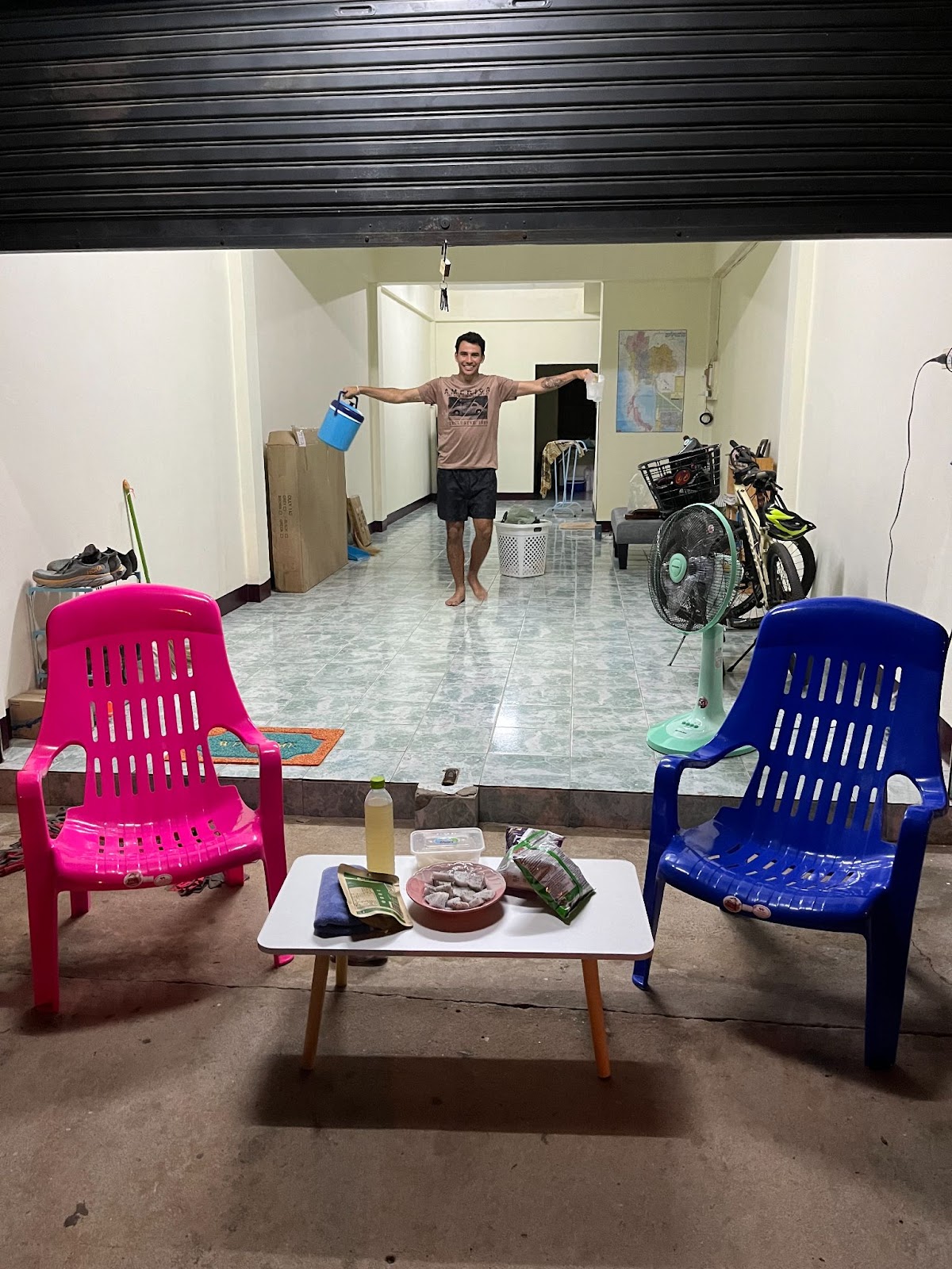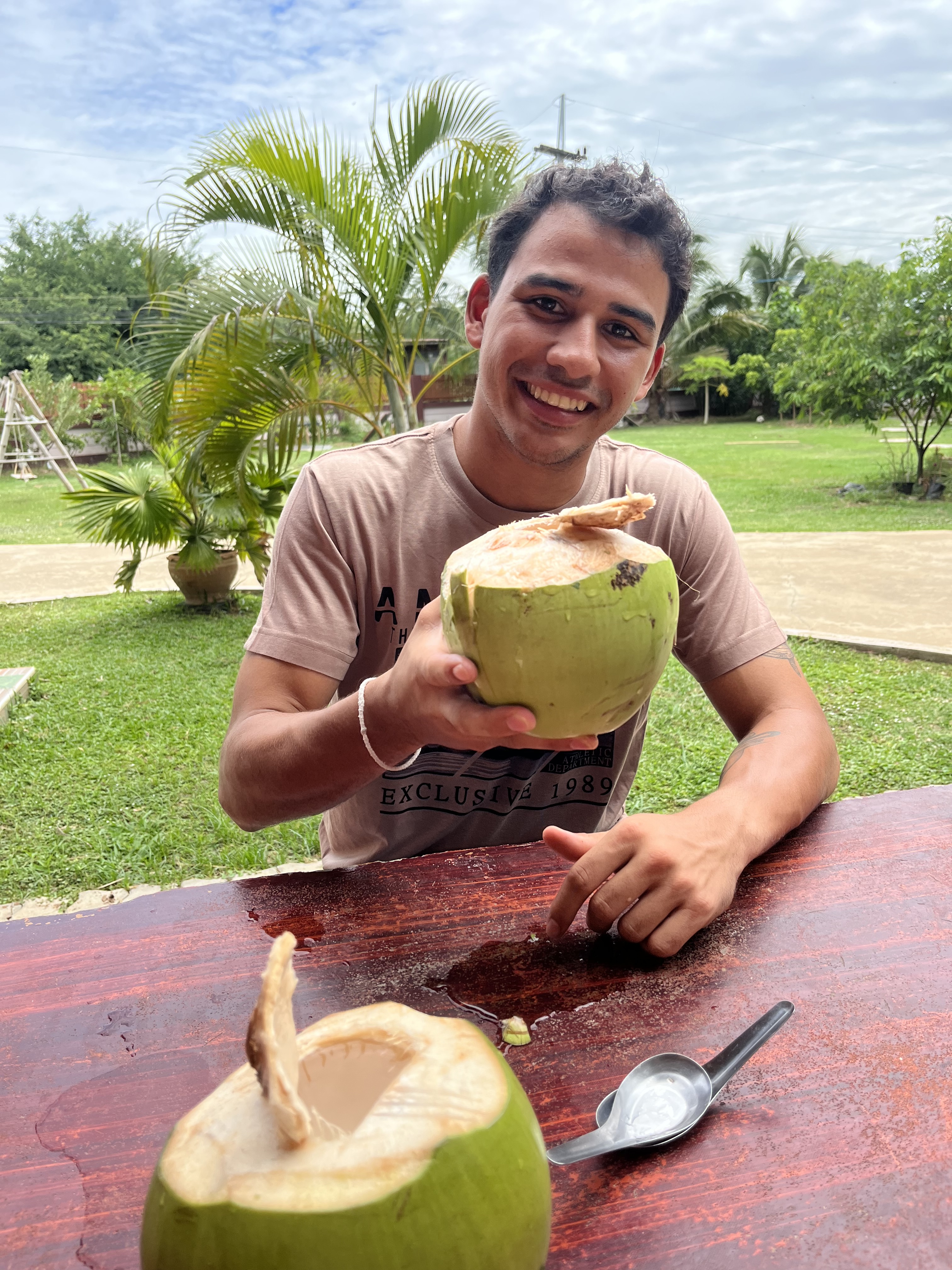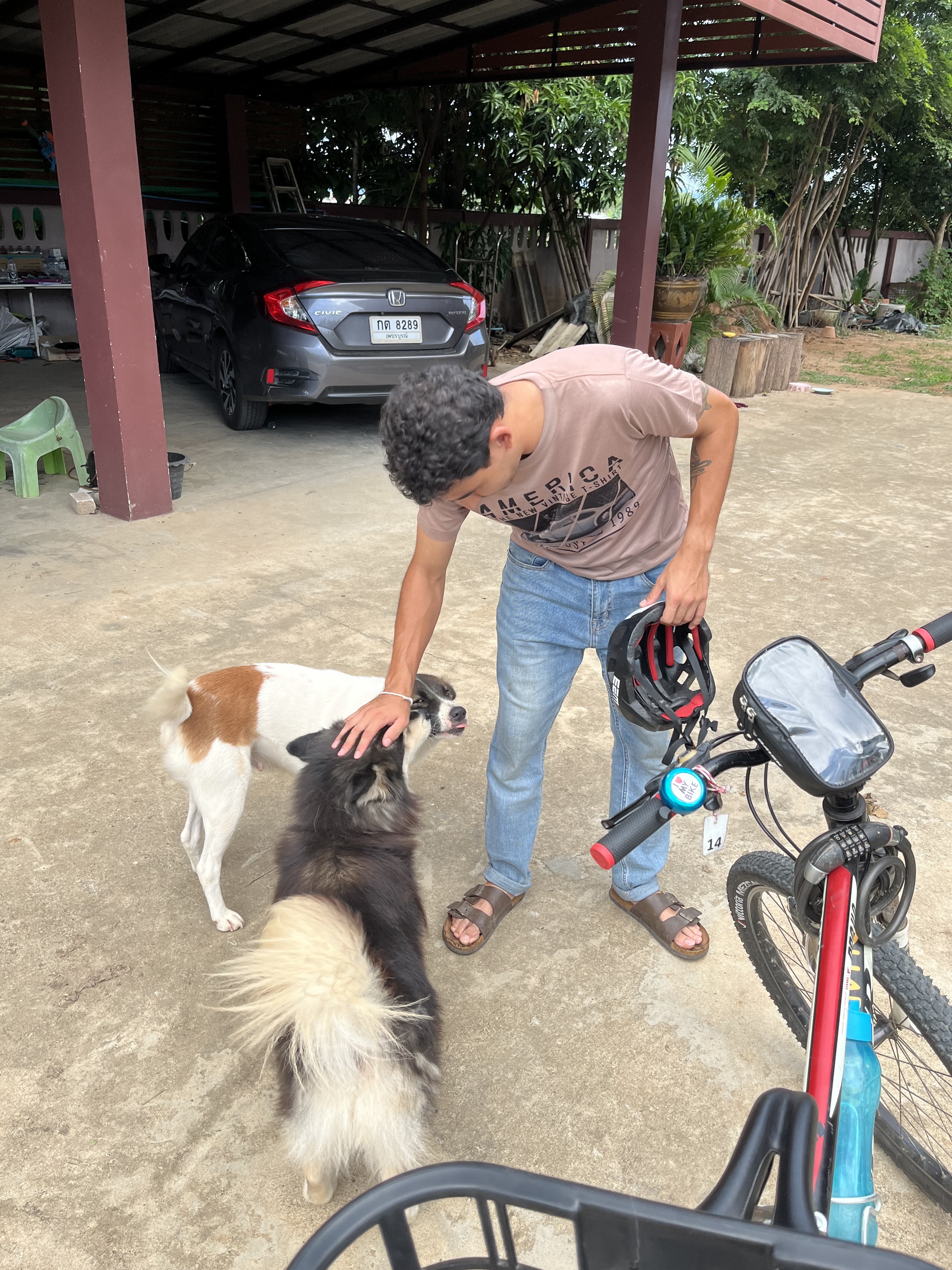 Dito still lives less than a 10-minute bike ride away from his former host family’s gorgeous Thai traditional house, and they invite him over often for meals, to use their washing machine, joke around with his host brothers, and play with their dogs who absolutely adore him. When we went there in the morning to do laundry his host brother cut down some coconuts from the family’s tree while we waited to take our clothes out to dry, and the whole scene was very idyllic.