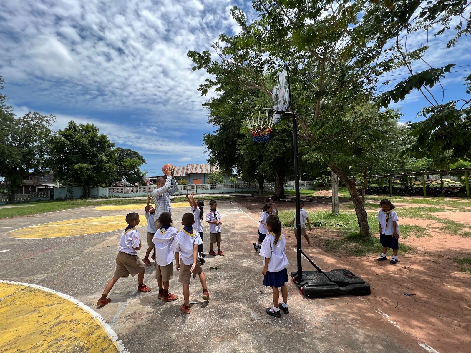 Also, I bought a basketball hoop since my village does not have one. I set it up in the school, and the kids love it. Soccer and volleyball are the primary sports, so most are newcomers to hooping. All the more fun. They double dribble and travel like they’re on bpai tiao [vacation] (ไปเที่ยว), but they’re learning. The hoop also doesn’t stand more than nine feet, allowing me to dunk on and Mutumbo block children, which is amongst life’s greatest joys.