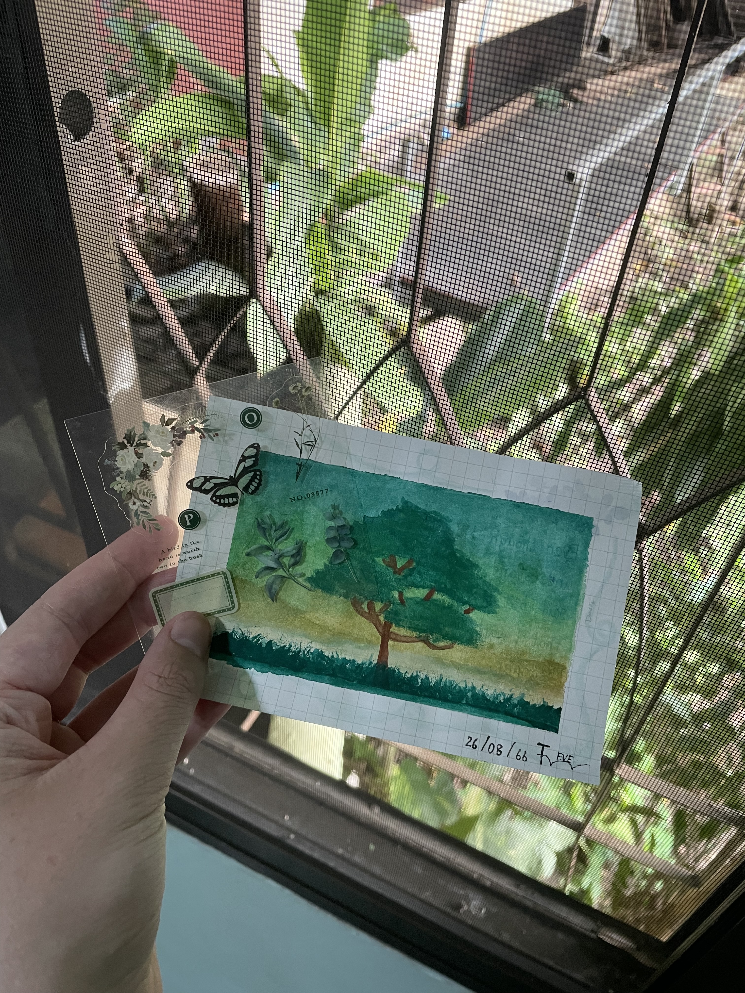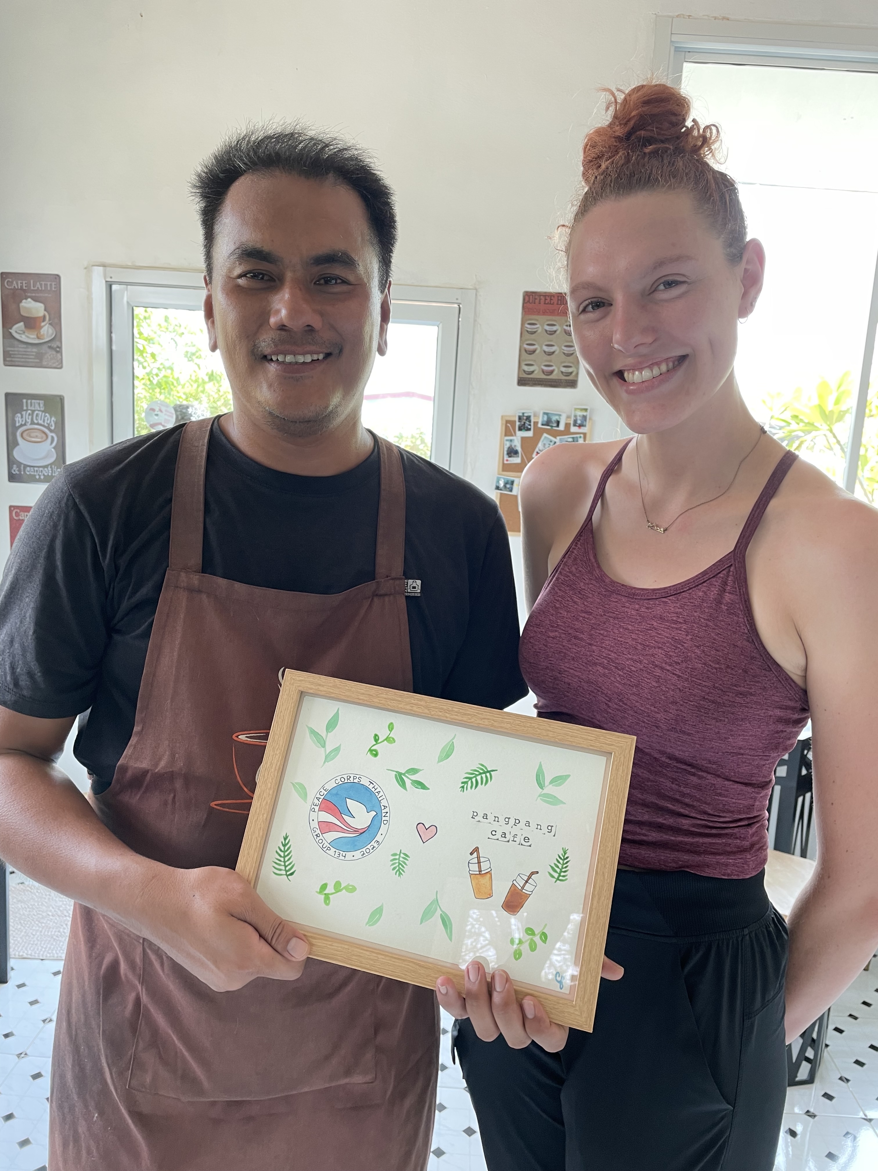 I’m incredibly sentimental. I’ve long favored small thoughtful gifts over anything found in a store. For any event—birthdays, Christmas, thank yous—I jump at the opportunity to pull out my watercolors, pretty pens, and hoarded paper scraps and ribbons. I don’t claim to be particularly talented at any medium, but I love the process of making something out of nothing—the ability to embed significance into something ordinary. It follows then, that I really enjoy making art for the important people in my life here in Thailand, such as this painting for Pi Ohh, the owner of PangPang, a small coffee shop myself and other volunteers practically lived at during PST.