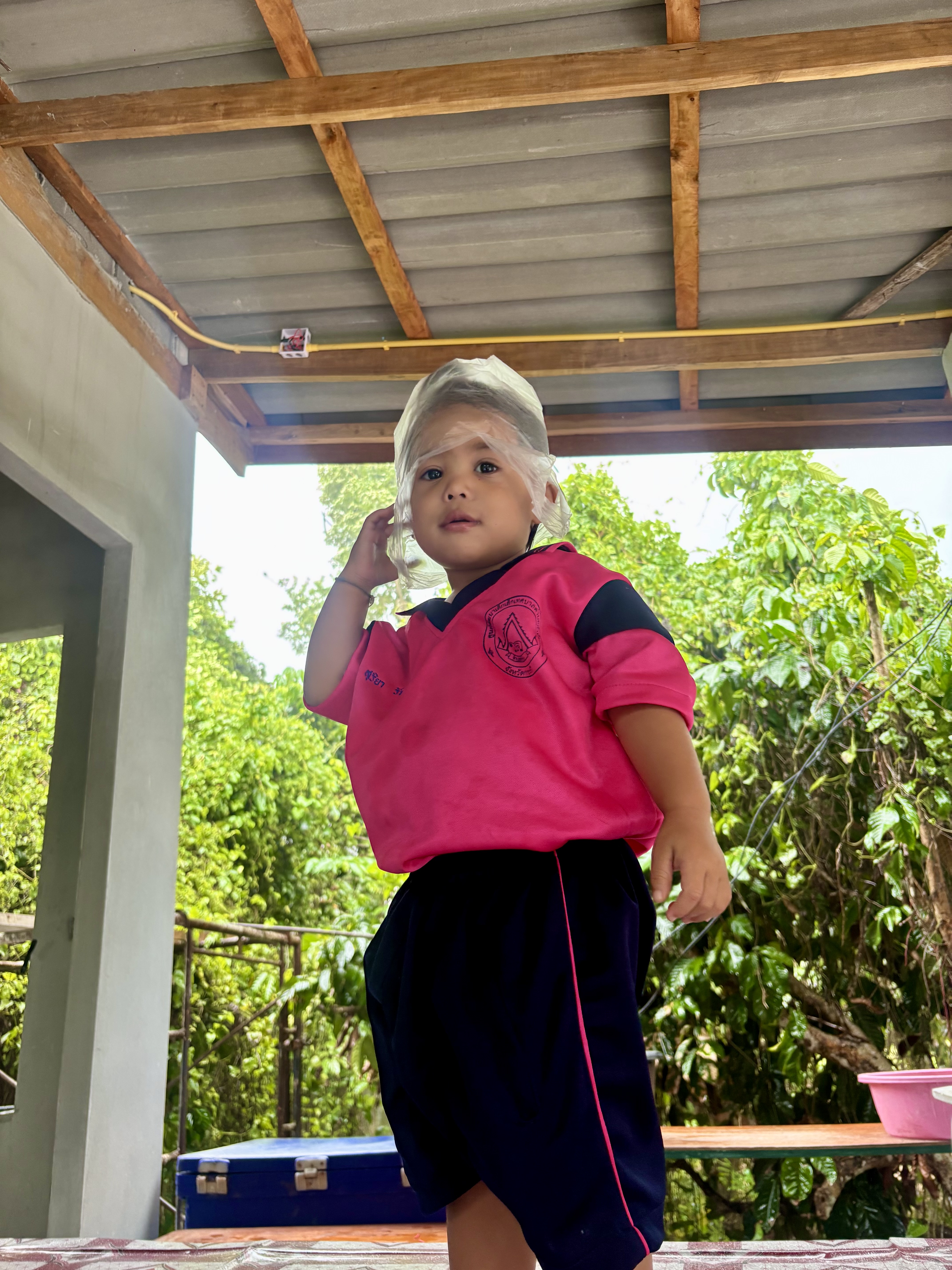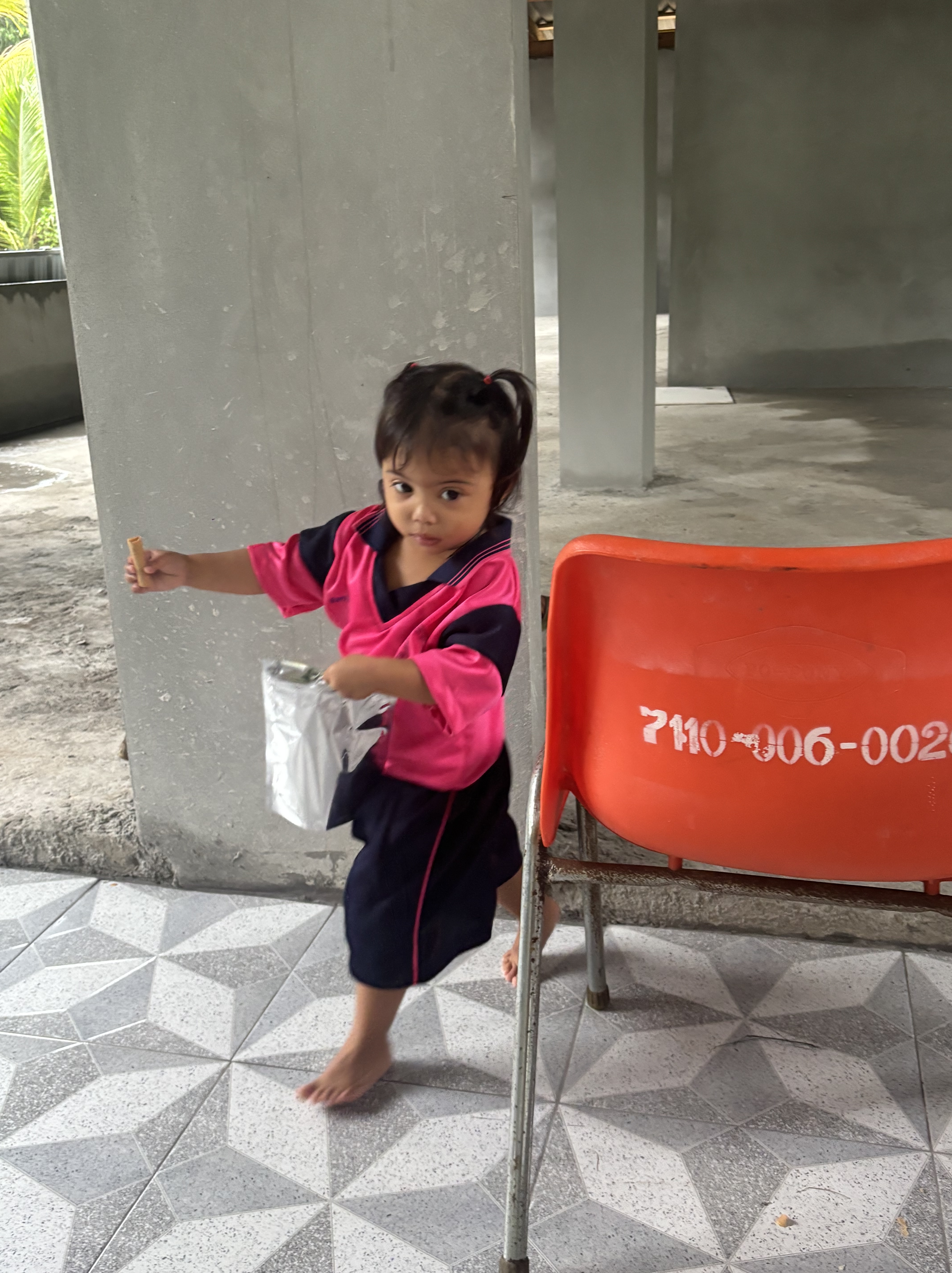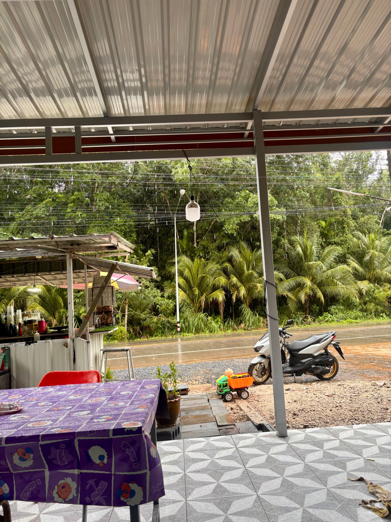 I spotted the small drink booth selling coffee and tea that I pass every day on my way to this school, and pulled off under the awning as fast as I could. Under the open shelter sat a family of five—twin two-year-olds wearing a school uniform I recognized from one of my other schools, their mom, and their grandparents. They saw me cut across the road toward their house and immediately began moving chairs around, motioning for me to come sit and get out of the rain, all while sporting the biggest smiles on their faces. I immediately knew I had made the right decision.