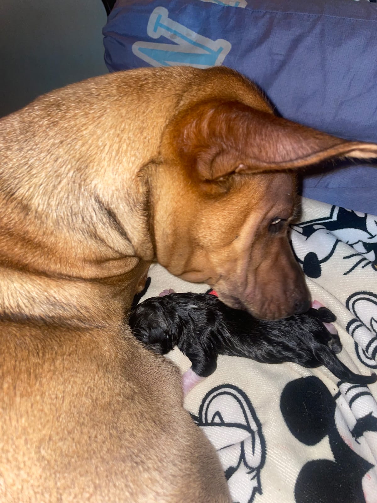 It felt like I cried for days. I was so scared at the idea of losing her just as I had lost Jude. I look at her and my heart explodes. All I want is for her to be healthy and safe. Plus, I knew absolutely nothing about dog pregnancy. After I calmed down, I started research. Let’s just say, my internet search history for the last five months is absolutely cursed. Suddenly, my life got much more complicated. I was working, attending trainings, planning events, and, now, taking care of a pregnant dog. Thankfully, my parents were able to help me find great resources on how to help Bea through pregnancy. They scanned an entire book about whelping a dog. Whelping is a term used to describe preparation for the dog and puppies during and after the birthing process. For a while, it was a waiting game. I would take her on light walks, feed her vitamins, and try to get her as much protein as possible. Finally, in early November, I had just returned from a trip with my older brother, who had come to visit with friends, and I had left Beatrice at a dog hotel/veterinarian in the city just in case she went into labor. She hadn’t, but less than 24 hours after being back at home, it was time. Almost immediately after returning home, Bea started exhibiting signs of labor: nesting, heavy panting, restlessness. I was exhausted from travel but I refused to let her go through this alone. Given the time constraints and the lack of access to basic materials, it was not ideal conditions. I tried setting up the large cage for her to give birth, but instead, she chose my bed… of course.