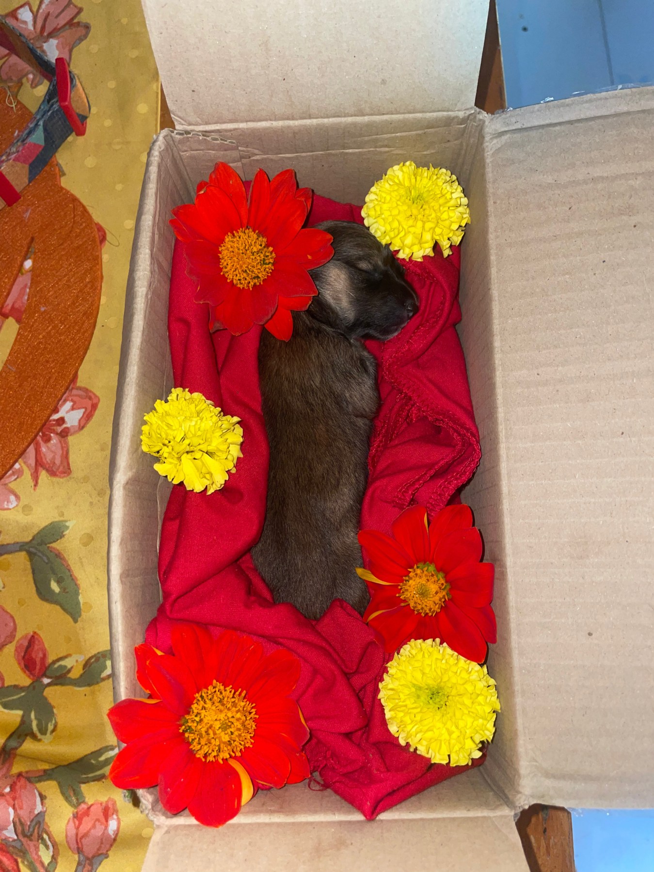 One of the puppies was especially small. I called him Tua (bean, in Thai). On the third day, I woke up and saw that little Tua had passed. I sat with Bea and the babies as I held him in my hands and cried. He was the first to be named. I gently placed him in one of my t-shirts inside a box, placed flowers around him, marigolds amongst others. Marigolds are a very spiritual flower in Thai culture. I laid him to rest and handed him over to my host aunt for her to bring to the local temple, across from my house.